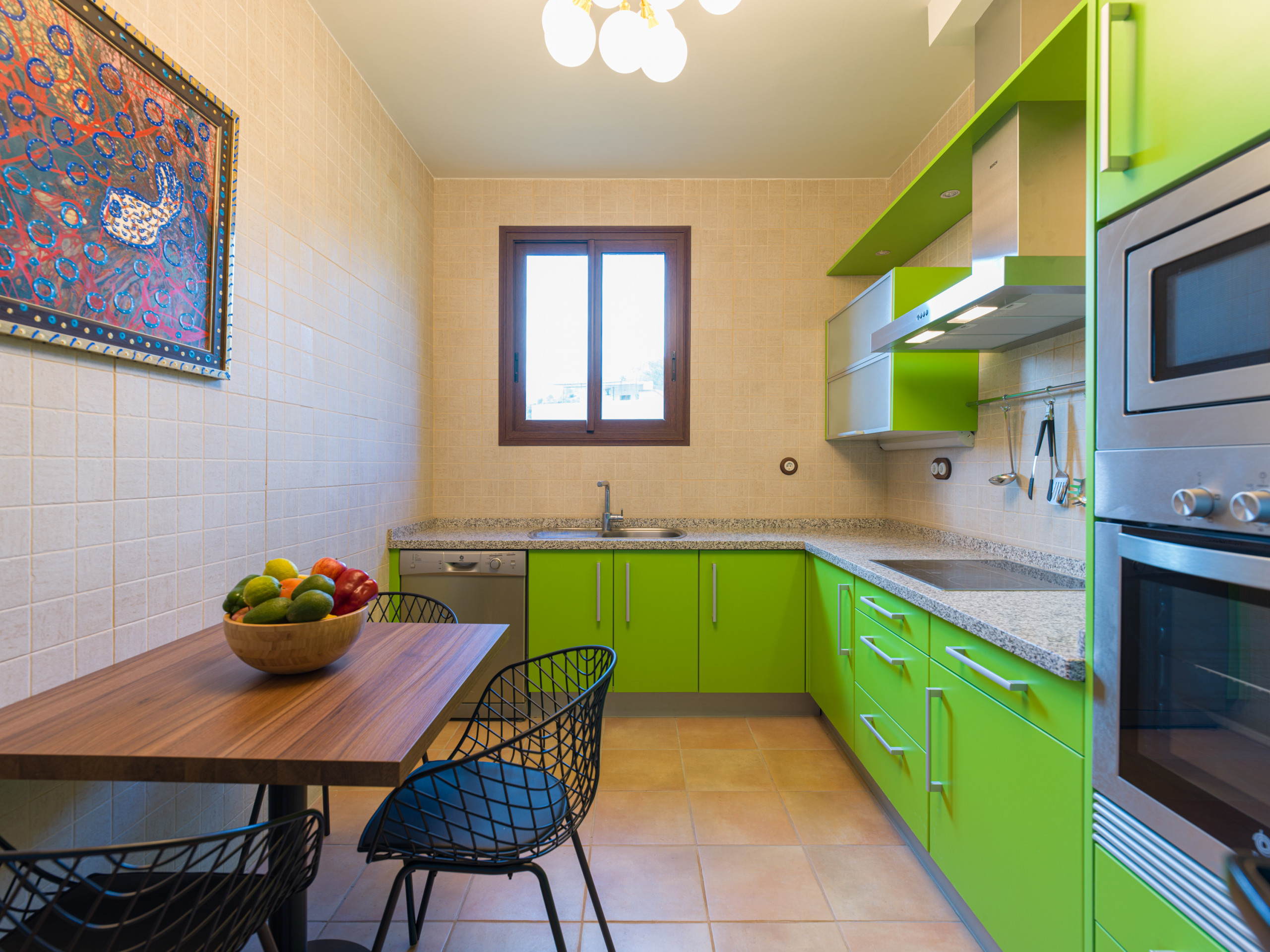the kitchen, oven, freezer, dishwasher, dishes/cutlery, kitchen utensils, coffee machine, toaster and kettle are provided.